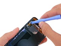 Insert the plastic opening tool between the display assembly and the rear case near the top of the iPod.