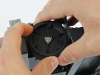 Using a small Flathead screwdriver, remove the small black clip in the center of the wheel.