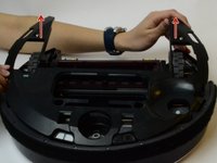 With the Roomba upside down, locate the two yellow buttons by the extractor.