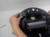 Grip the side brush module casing and lift it out vertically, perpendicular to the Roomba.