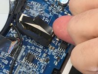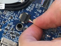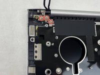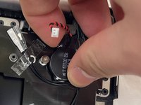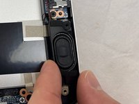 To remove the left speaker, first peel off the microphone/headset cable, then the adhesive strips.