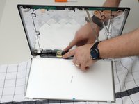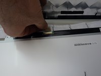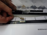 Using the plastic tab, peel back the tape securing the LCD cable the panel connector.
