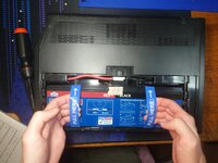 Once the shell is free, remove the cables from the battery compartment. The red wire may take some wiggling but it will fit through the hole.