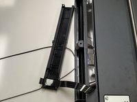 Using your screwdriver press down on the tab as shown. This allows the hinge to be removed from the printing body as seen in photo.