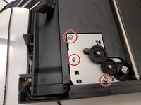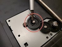 Remove the 3 highlighted screws. For the gear driven by the motor, press the tab in highlighted gear to remove set gear. For the gear that was attached to belt, remove C-clip to remove gear then pull the last gear off.