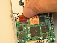 Let's remove the LCD Screen. Gently lift the black cam and remove the flexible cable. You can grab it with tweezers or use one of the holes in the flex cable to pull it back from the connector.