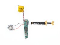 Since at first we're not succeeding, we pry, pry again with some heat and a deft spudger. The buds finally give up their (decidedly non-modular) internals: motherboard, driver, and battery.