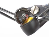 Here we are putting the squeeze on the speaker portion of these buds, with help from our trusty bench vise. It deforms the buds' outer shell just enough to open up a seam—a chink in the armor, if you will.