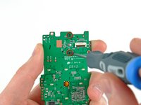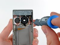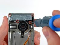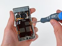 Remove the two Phillips screws securing the camera lens to the logic board.