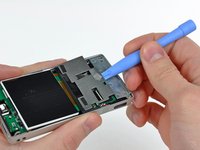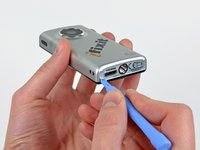 Begin the disassembly by inserting a plastic opening tool (with the edge pointed toward the aluminum outer case) between the front and outer cases near the bottom of either edge of the MinoHD.