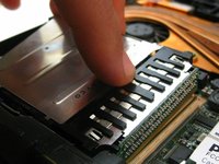 To remove the RAM memory stick, push both metal pieces holding it in place outwards, and the stick will pop up. -picture of RAM inside -