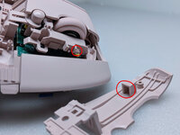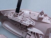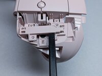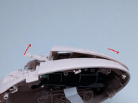 The switch assembly is snapped into place. Pry at the locations indicated in the first and second photo and it can be removed from the top shell with minimal force.