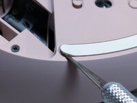 The side buttons are also held in with a snap fit. Pry at the locations indicated to loosen them. The buttons themselves might get caught on the casing, so push them in to remove them.