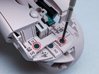 The right button is attached with two screws, as highlighted. These are different from screws from previous steps, so keep them separate.