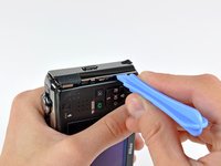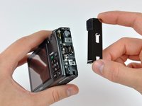 After a few pries with a plastic opening tool, the chromed plastic side cover simply pops off the camera body.