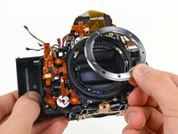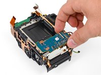 At this point we'd like to stop and let you appreciate the space management that goes into designing a DSLR camera. Wires and ribbon cables run amuck, yet everything works together in perfect harmony, allowing you to express your artistic vision with the press of a button.