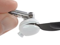 Since the vise and heating procedure was a good choice in previous earbud teardowns, we decide to put a little bit of pressure on the Ear (1) to get inside the opaque head.