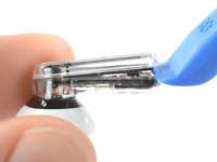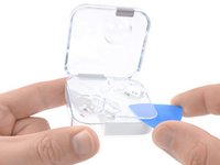 Fortunately, the clear adhesive used in the headphone stems isn't any more troublesome in the charging case. Some heat and a good slice from an opening pick grants us entry.