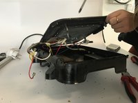What’s left now is the wiring in the bottom and the last heat shield. The wiring can be disconnected outside of the cover. There is little plastic parts attached, that can be taken off, after which the wires can be disconnected.