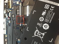 Remove the 6 battery screws then carefully pry the battery connector straight up to remove it.