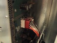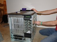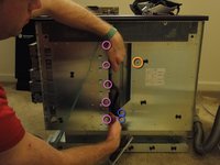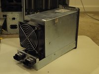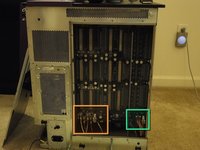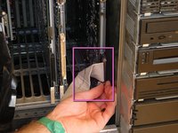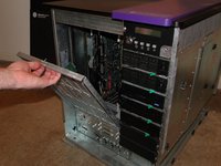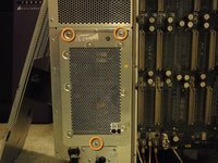 There is a cover on the right side of the chassis. Behind it, the SCSI backplane, auxillary fan, and line supply connections can be accessed.