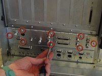 These screws hold in the SCSI backplane. Remove the SCSI bus connections and power connector and hold them out of the way when removing the SCSI backplane. Remove SCSI devices before removing the backplane.