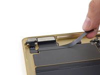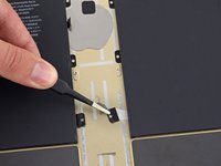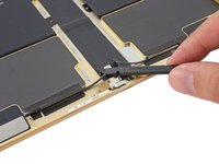 A bit of deft spudgering frees the remaining speaker connectors, and a flex cable that appears to run beneath the left battery cell to drive the Smart Connector contacts.